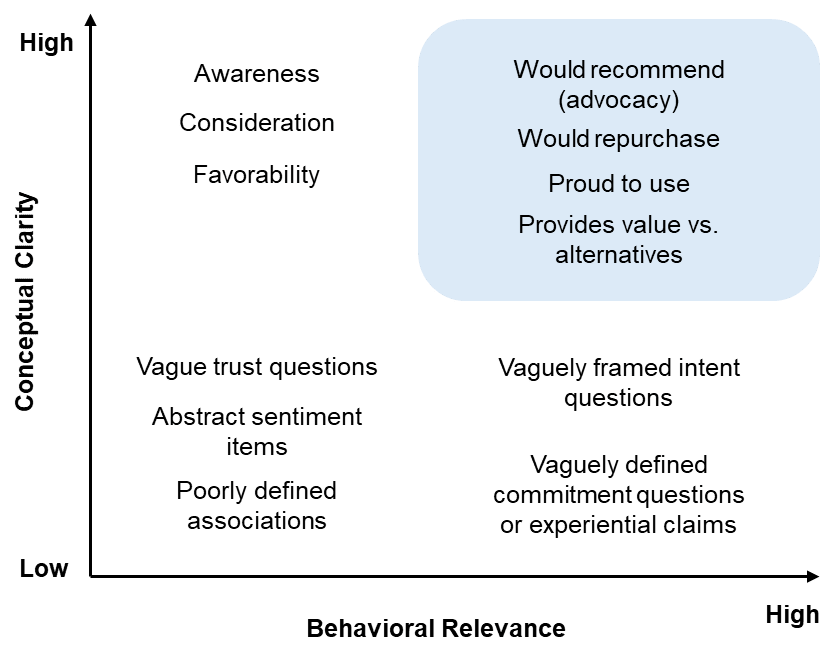 For a survey measure to be predictive of behavior, it must reflect how consumers actually think when making purchase decisions. This occurs in two ways:- First, the metric must involve some type of trade-off or choice, a judgment where one option is selected over alternatives, implicitly or explicitly. Questions like “Would you choose this brand over competitors at the same price?” put respondents in the same mindset they have when making real purchases.