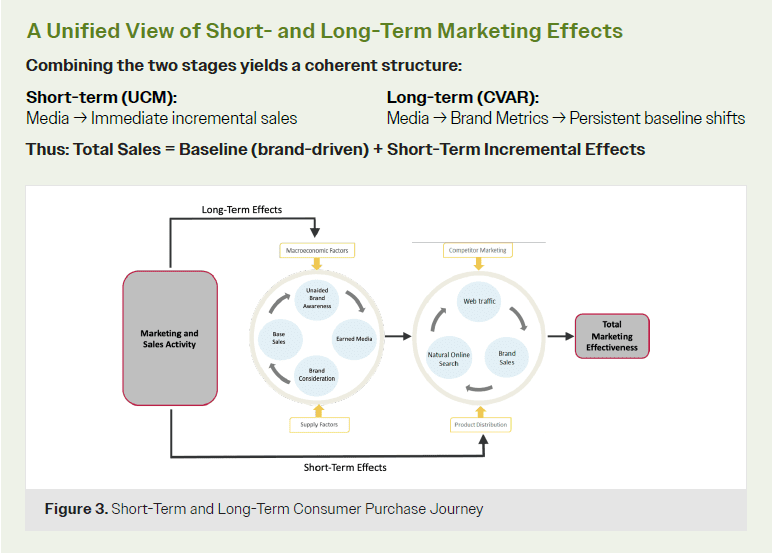 This framework offers several advantages. It separates short-term efficiency from long-term effectiveness, ensuring that brand-building is measured in a manner consistent with the marketing science literature on persistence (see References). It prevents the common error of attributing short-term fluctuations to long-term effects (or vice versa) and allows analysts to quantify both the immediate incremental response to marketing and its slower, brand-driven impact on baseline demand. In doing so, it provides a statistically defensible way to connect marketing activity to persistent changes in consumer preference and, ultimately, to enterprise value.